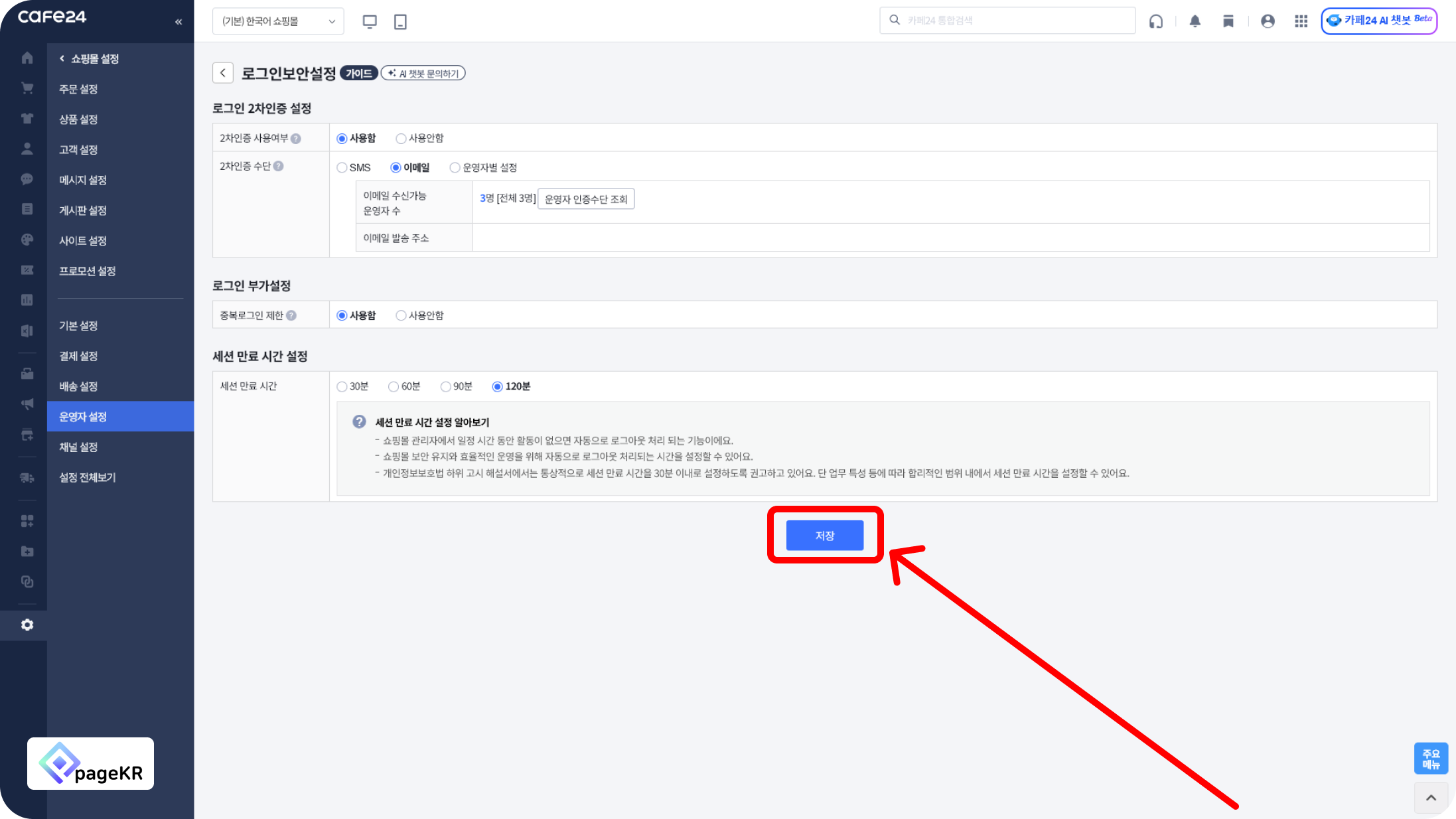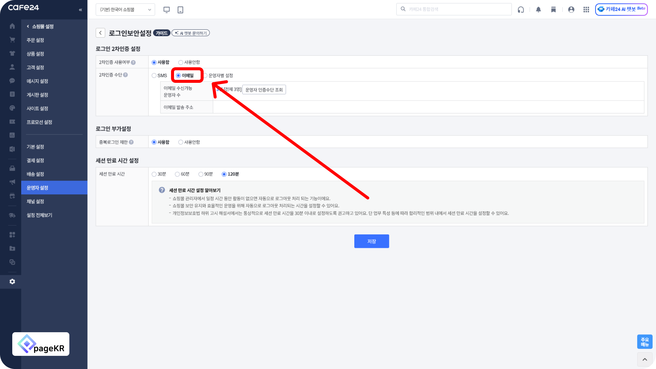 로그인 이메일 2단계 인증 설정을 위해서 [저장]을 눌러주세요.