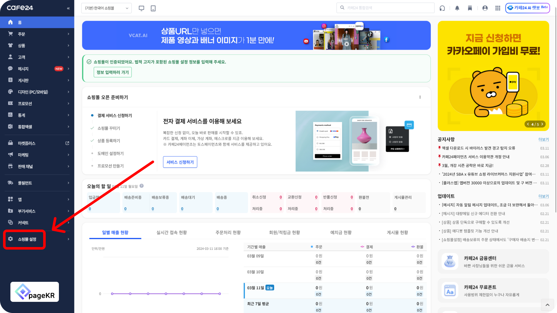 카페 24 2단계 인증 신청을 위해서는 [쇼핑몰 설정]에 들어가주세요.