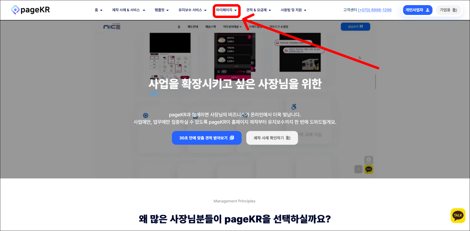 pageKR의 공식 홈페이지에 접속하셔서 [마이페이지]를 클릭해주세요.