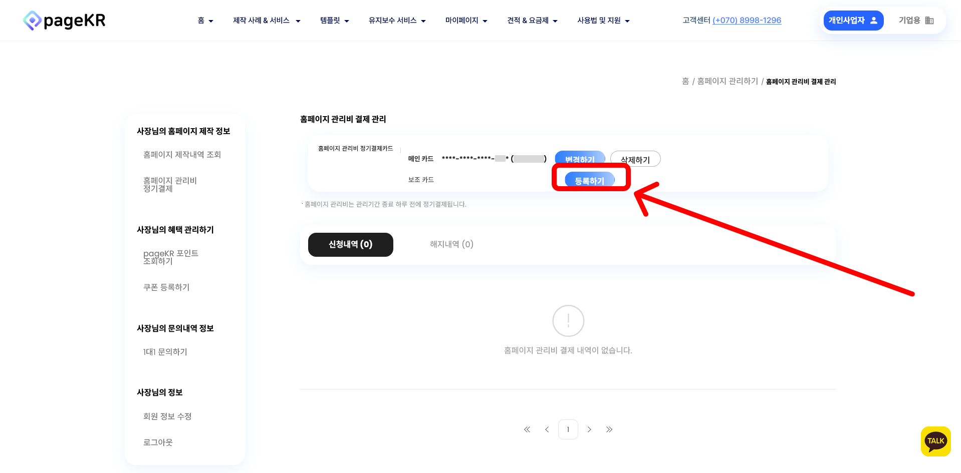 이렇게 홈페이지 관리비 결제 관리라는 화면이 뜨고, 카드 등록하는 화면이 뜹니다.