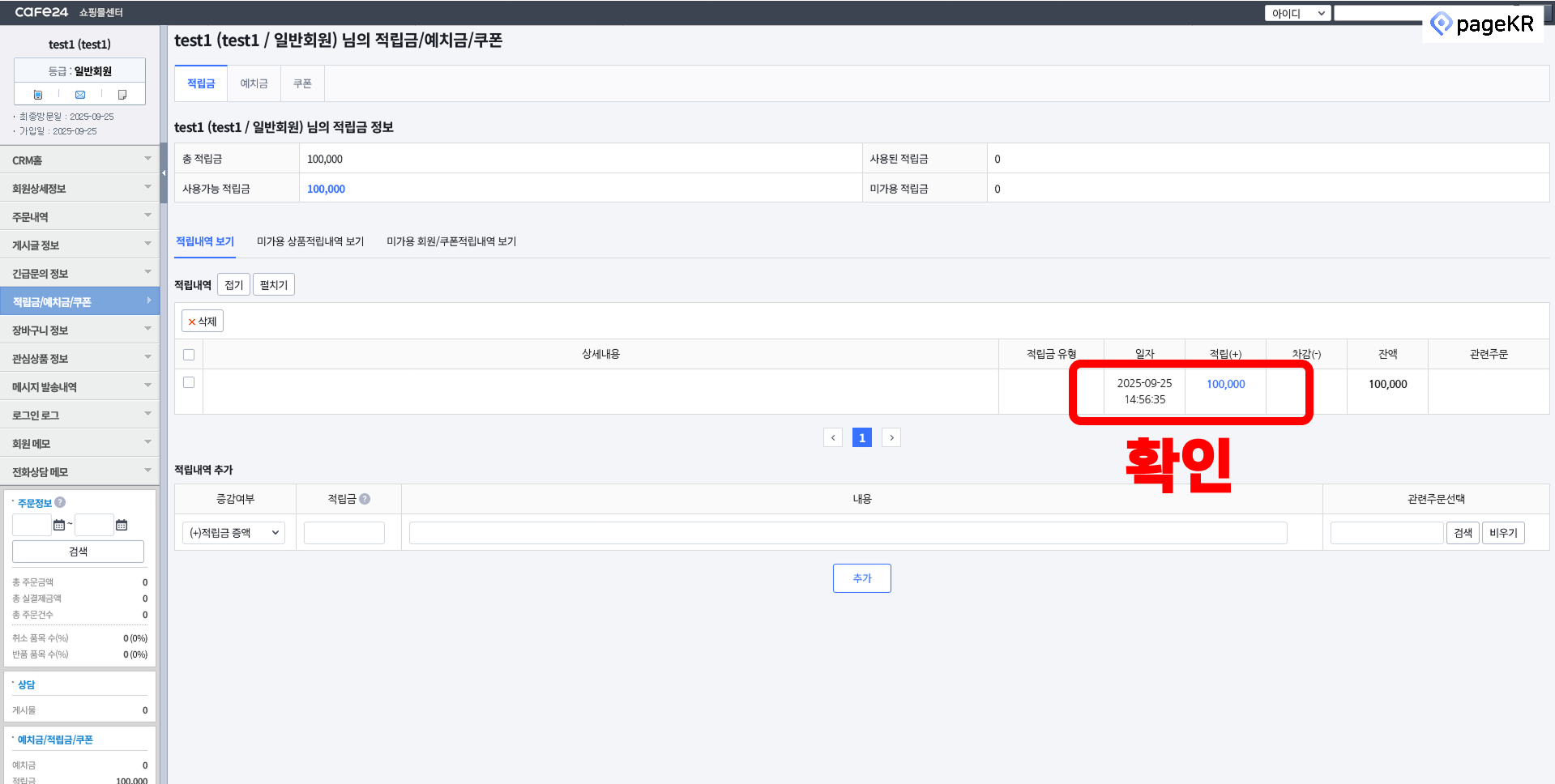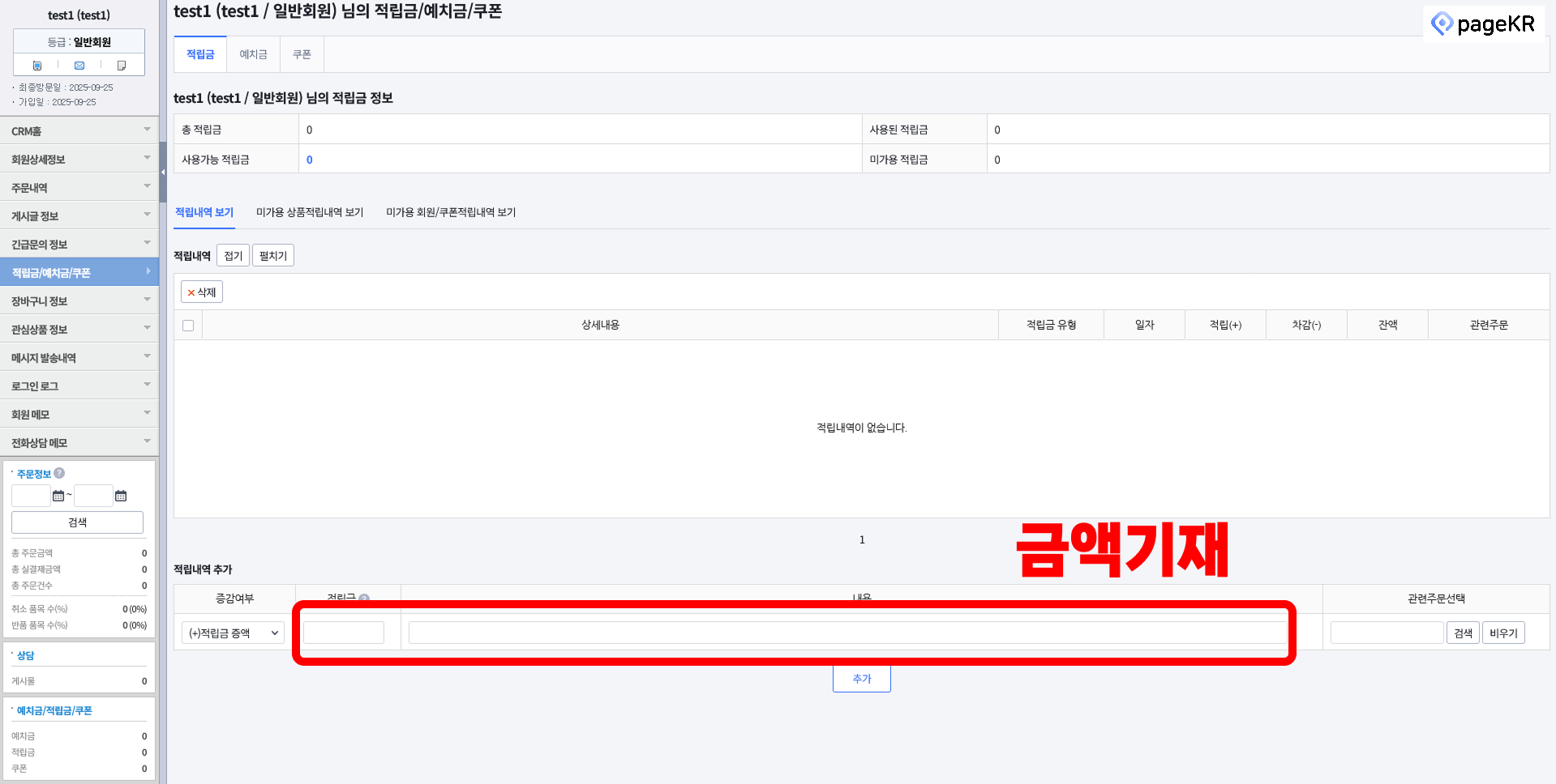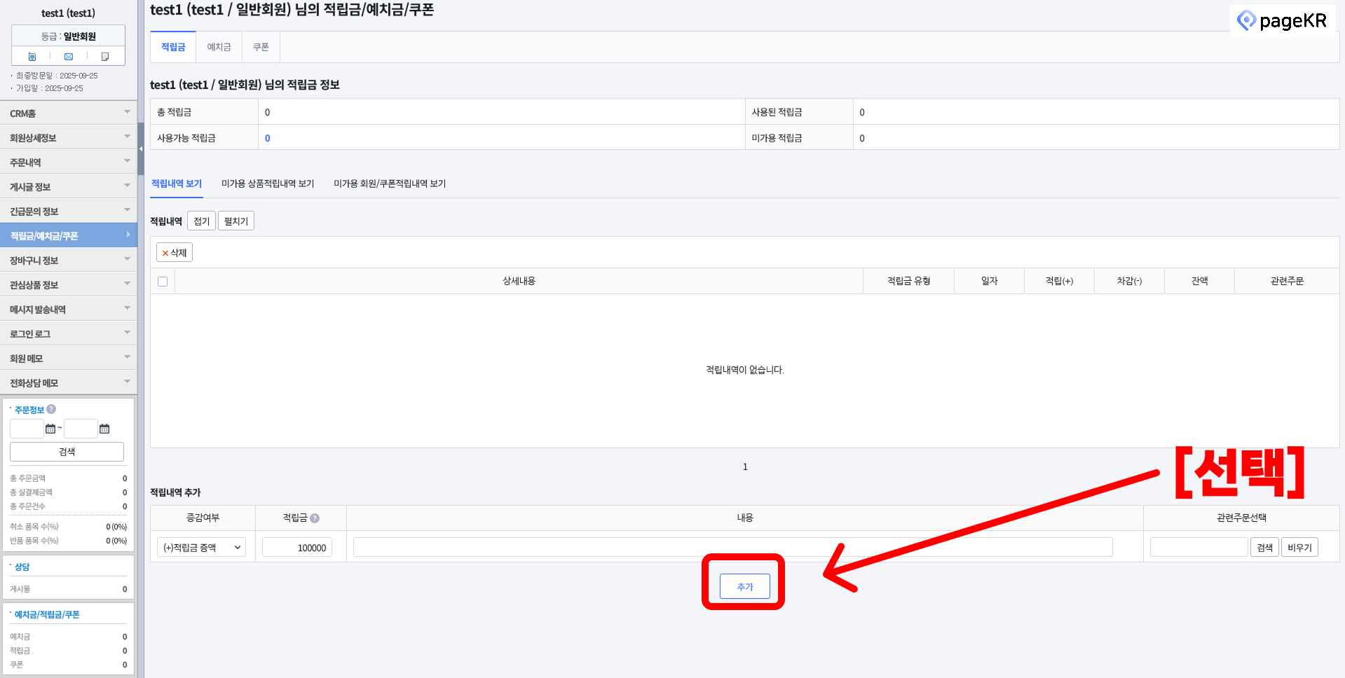 [추가]를 눌러서 적립금을 주실 수 있습니다.