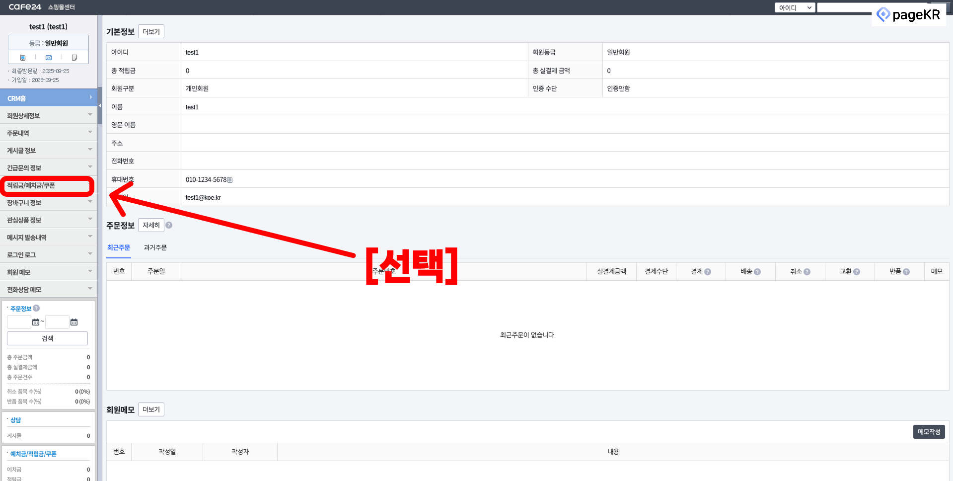 팝업으로 고객 정보에 대해서 뜹니다. 좌측 [적립금]을 눌러주세요.