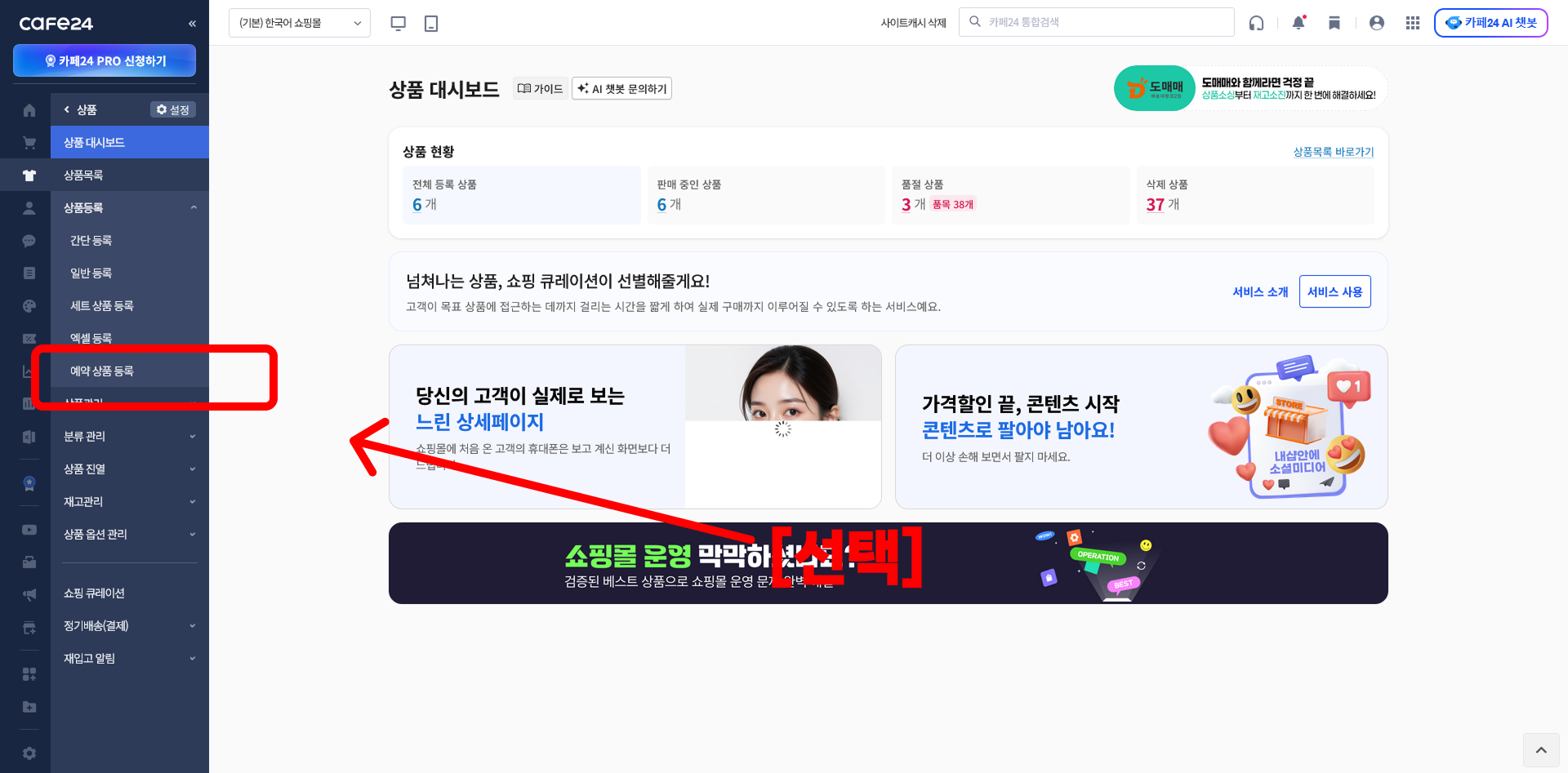 [예약 상품 등록]을 눌러서 예약상품 관리 화면으로 가실 수 있습니다.