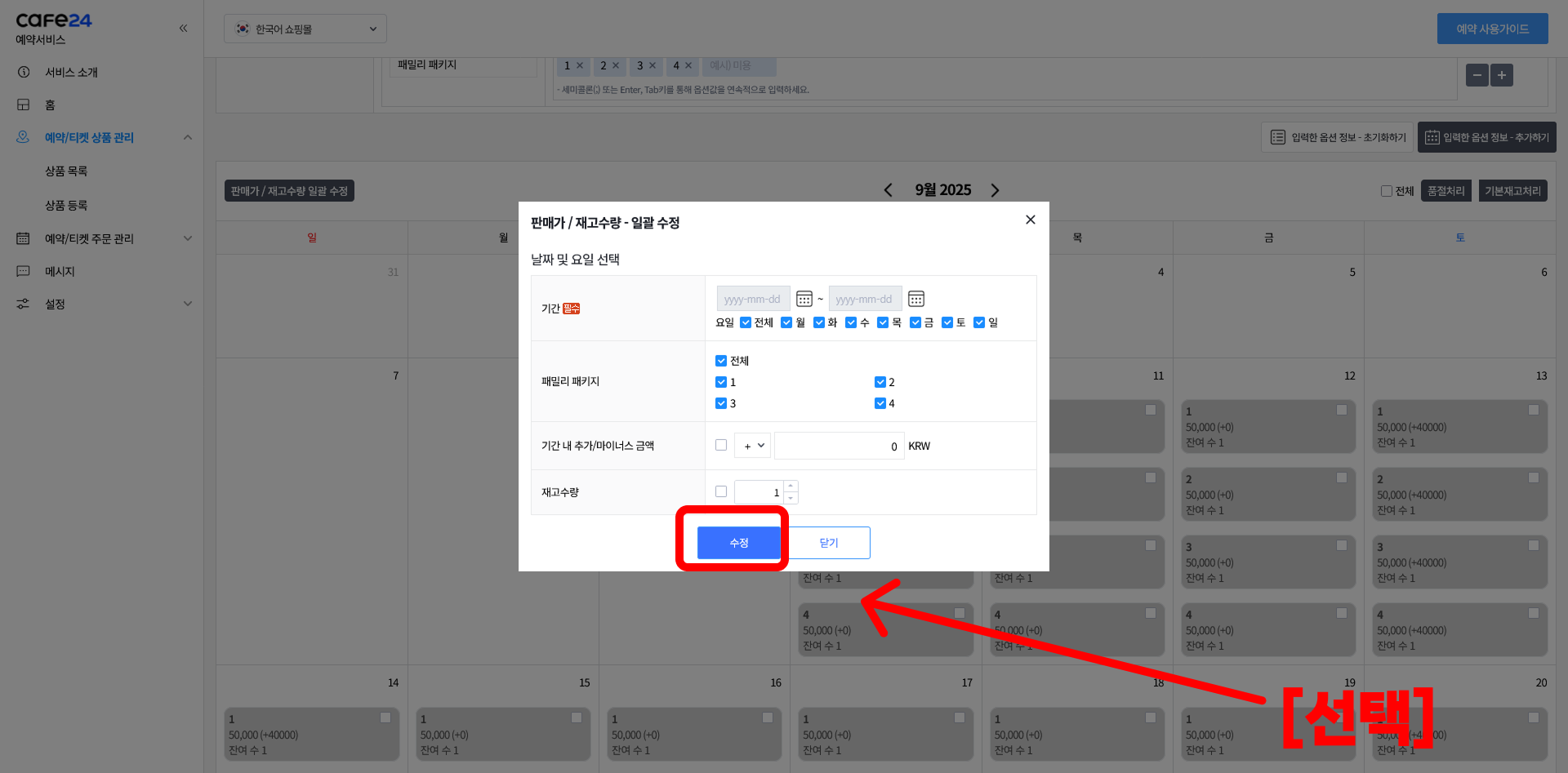 [판매가 / 재고수량 일괄 수정]을 눌러서 특정 날짜나 옵션의 금액 / 재고를 수정하실 수 있습니다.