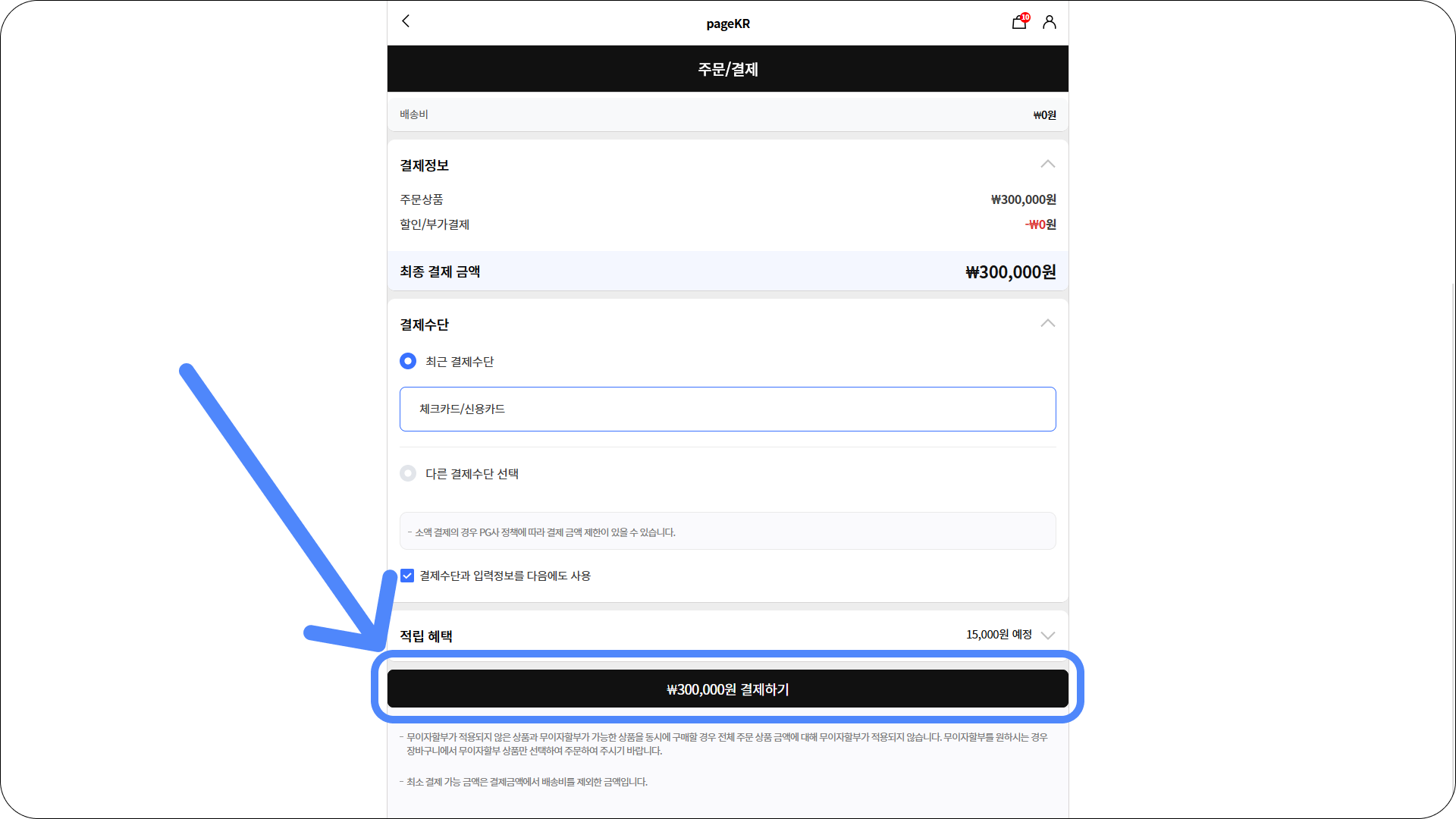 이렇게 정보를 입력하셨다면 결제수단은 기본적으로 체크카드 또는 신용카드로만 가능합니다.