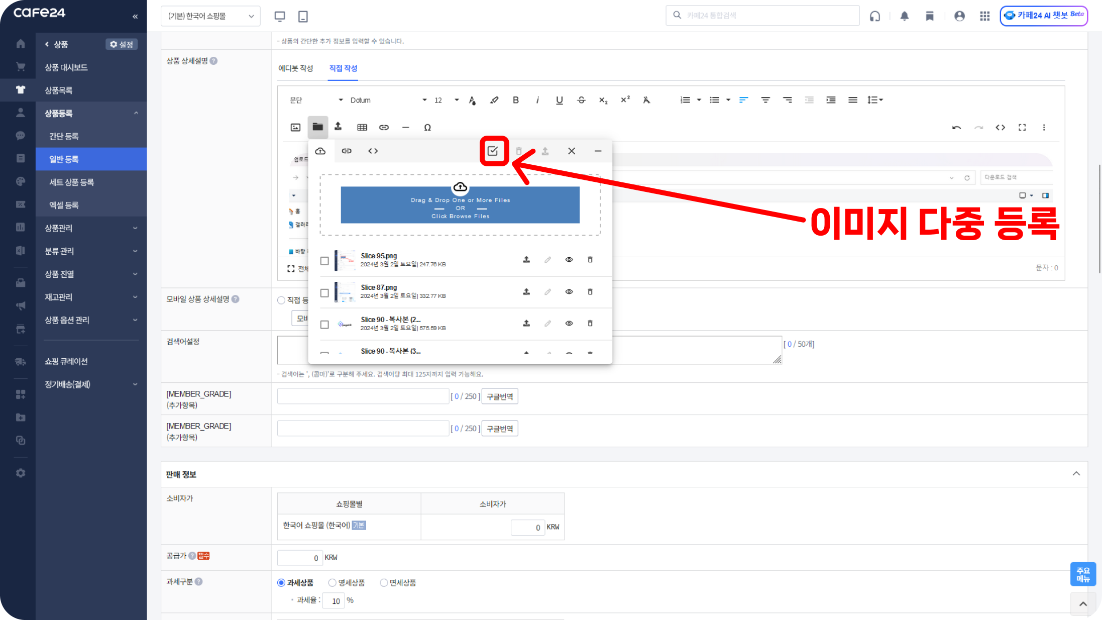 상품 사진 아이콘을 통해서 이미지 개별 등록을 하실 수 있습니다.