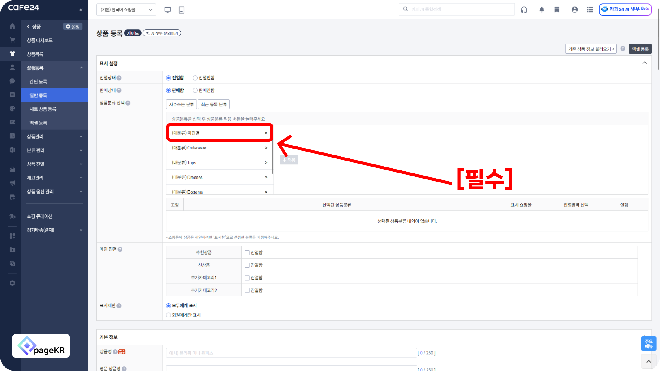 상품 분류는 필수적으로 선택해주셔야 합니다. 선택하지 않으실 경우에는 상품이 노출되지 않습니다.