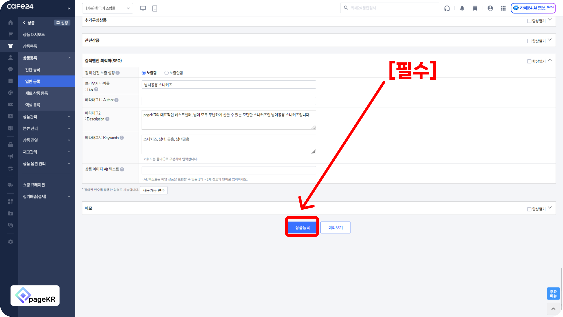 이제 가장 중요한 부분입니다. 상품 등록을 위해서 [상품등록]을 꼭 눌러주세요.