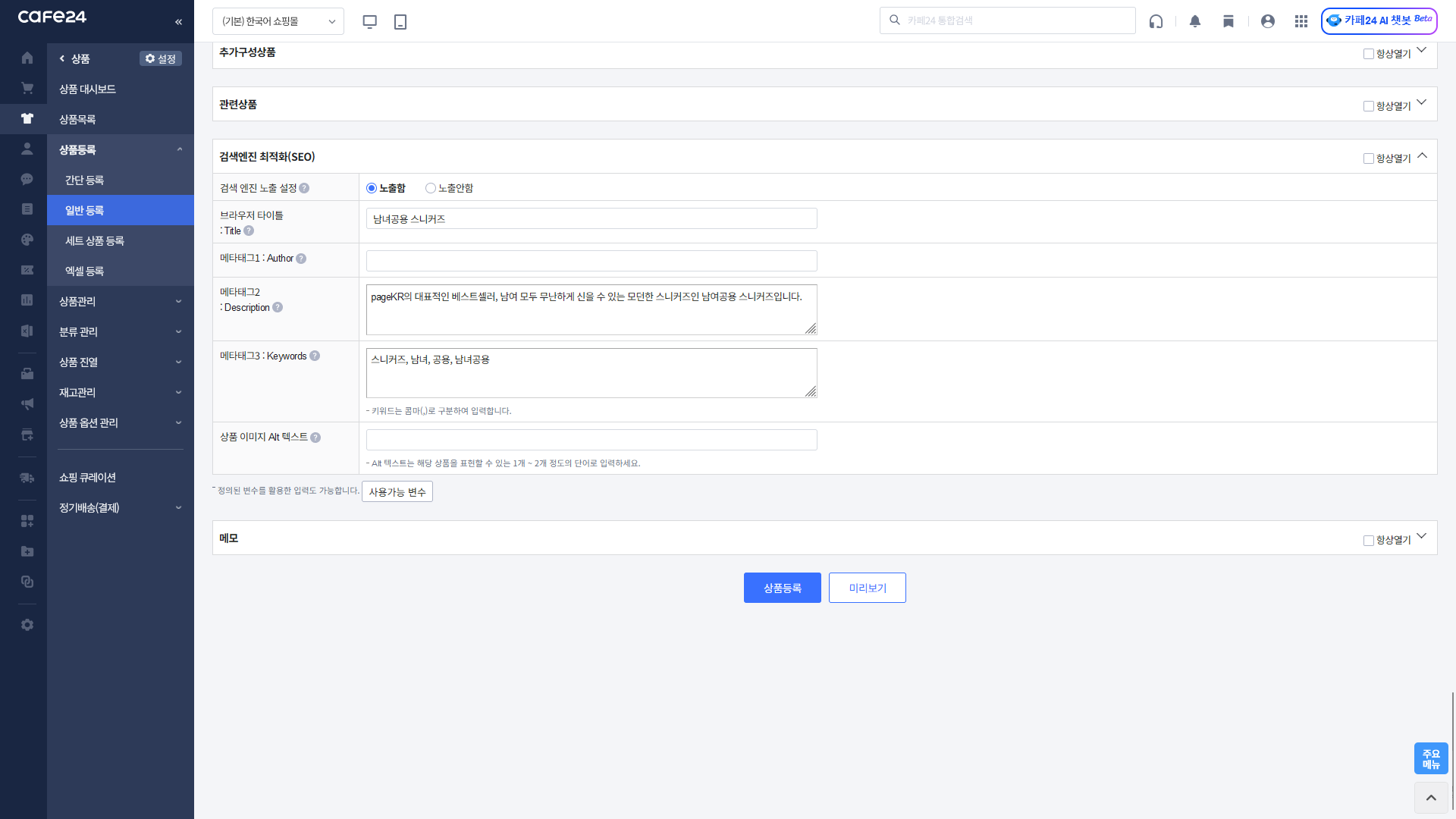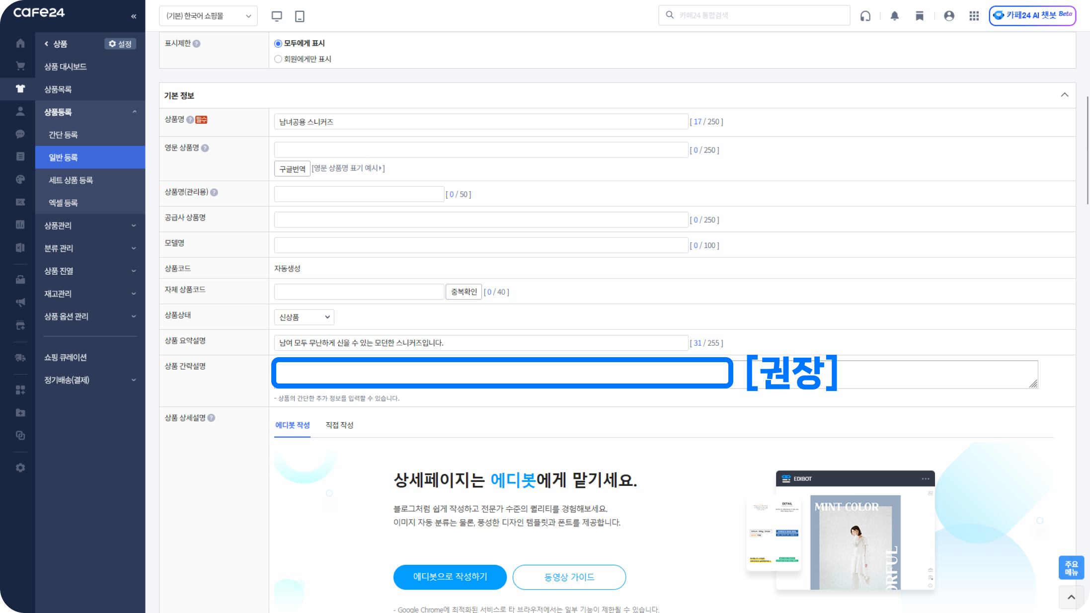 [추천상품]과 [신상품]은 상품의 진열을 위해서는 무조건 선택해주셔야 합니다.