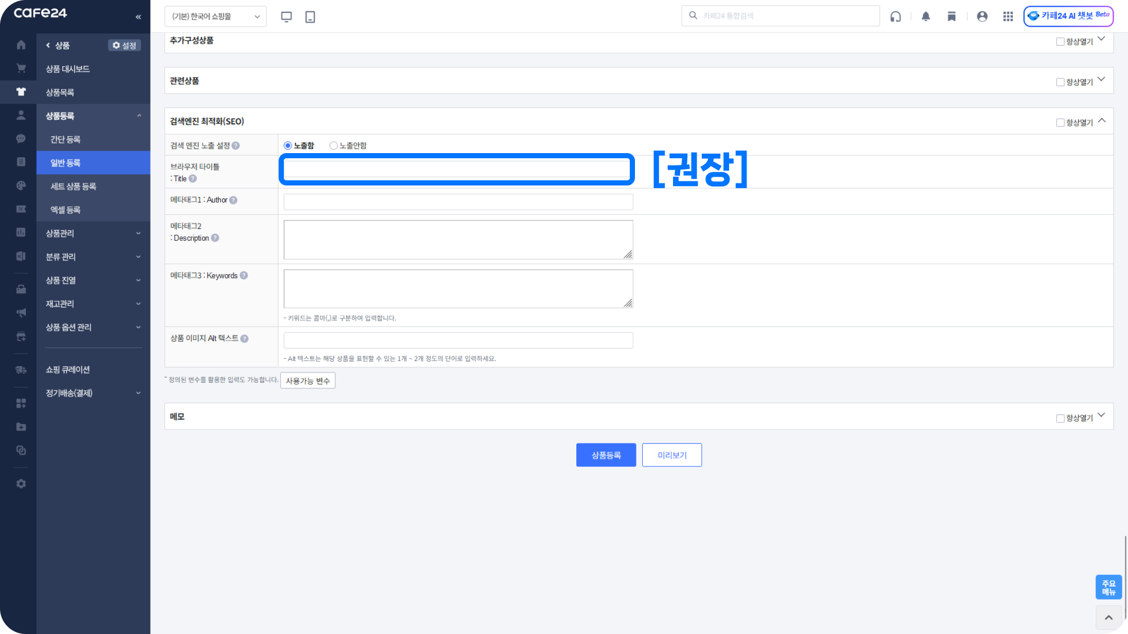 맨 위의 상품명을 브라우저 타이틀에 적어주시거나 복사+붙여넣기를 해주시면 됩니다.