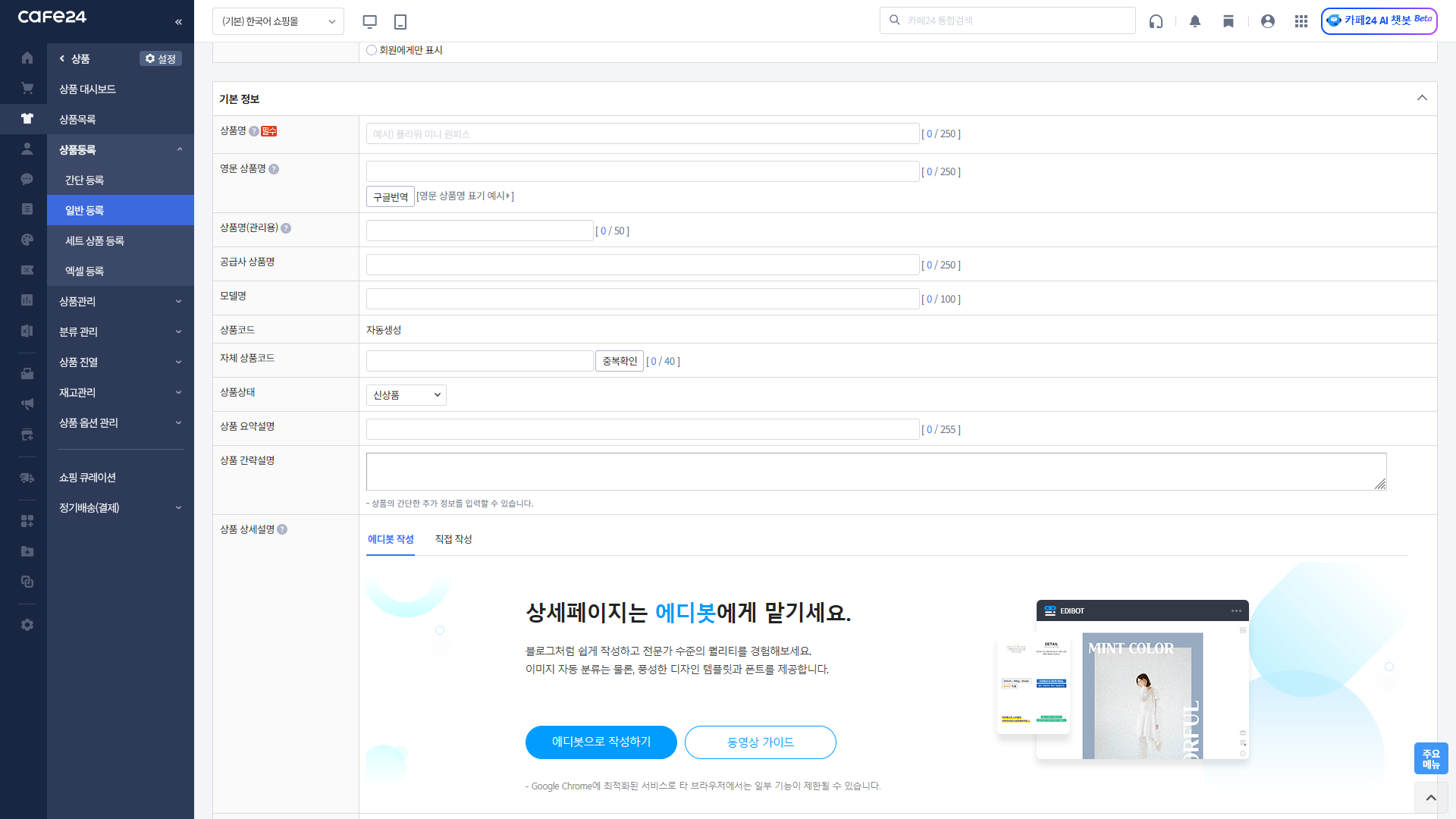 상품 상세페이지는 에디봇과 직접 작성 모두로 가능한데, 에디봇의 경우 일부 브라우저 미지원 등의 문제로 인하여 직접 작성 방법으로 안내해드리겠습니다.