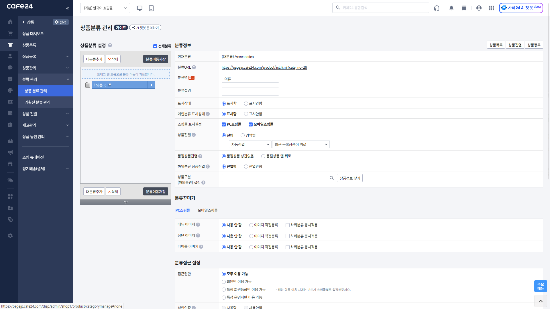 이렇게 현재의 상품 분류가 뜨는 것을 확인하실 수 있습니다.