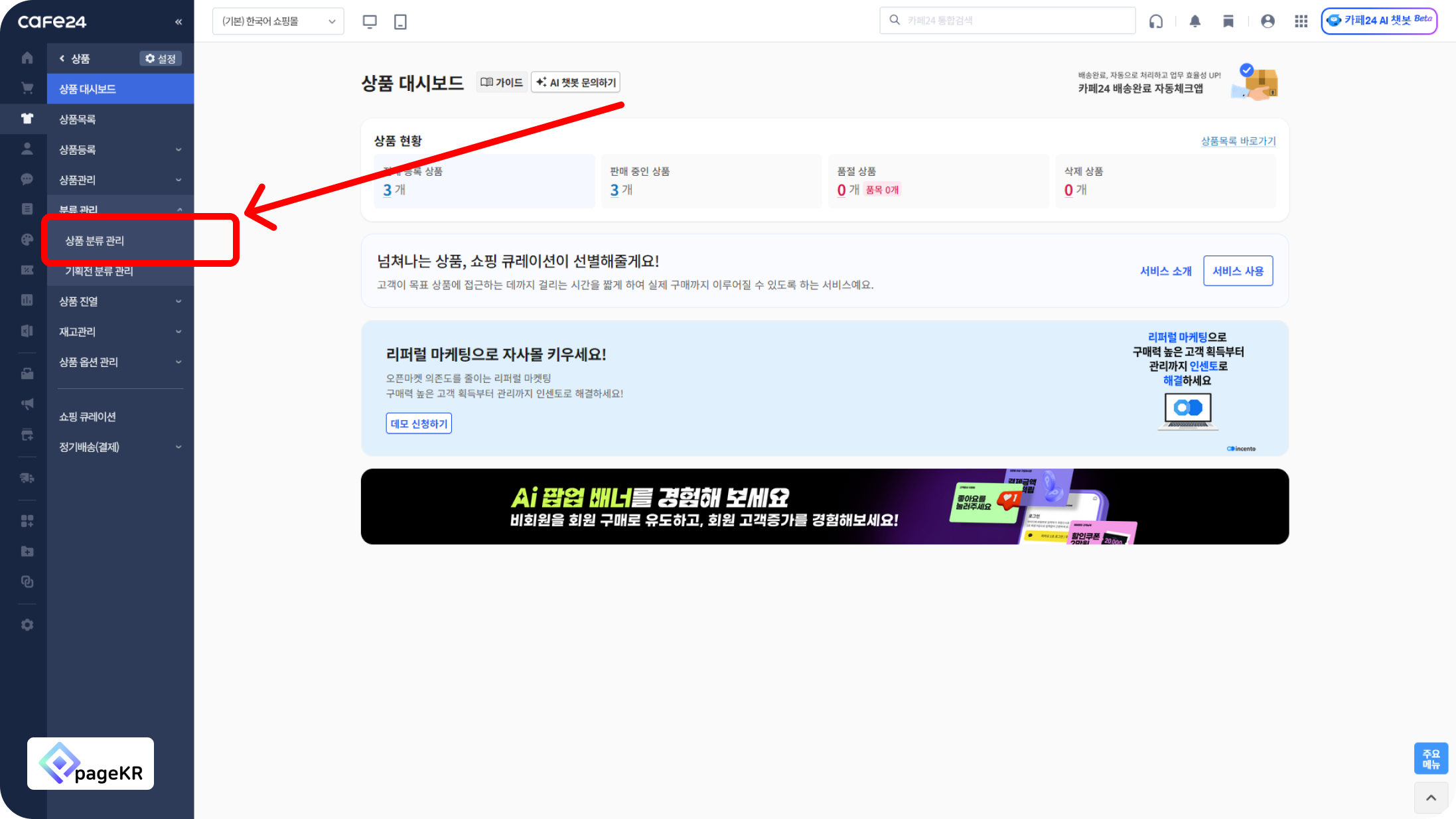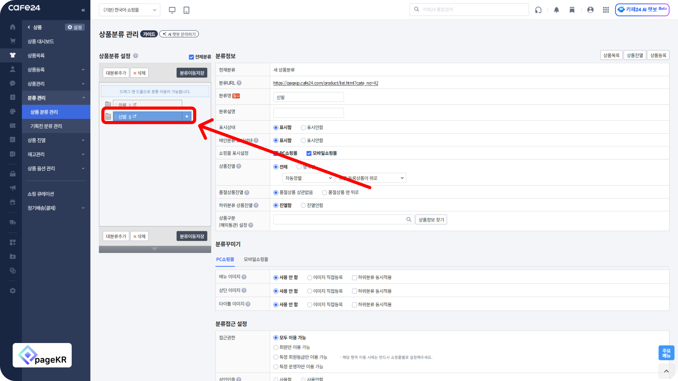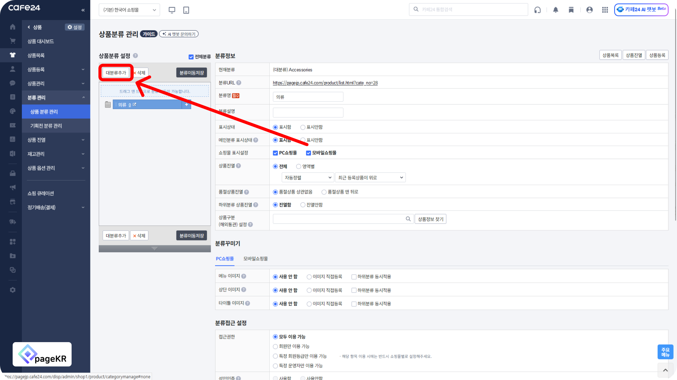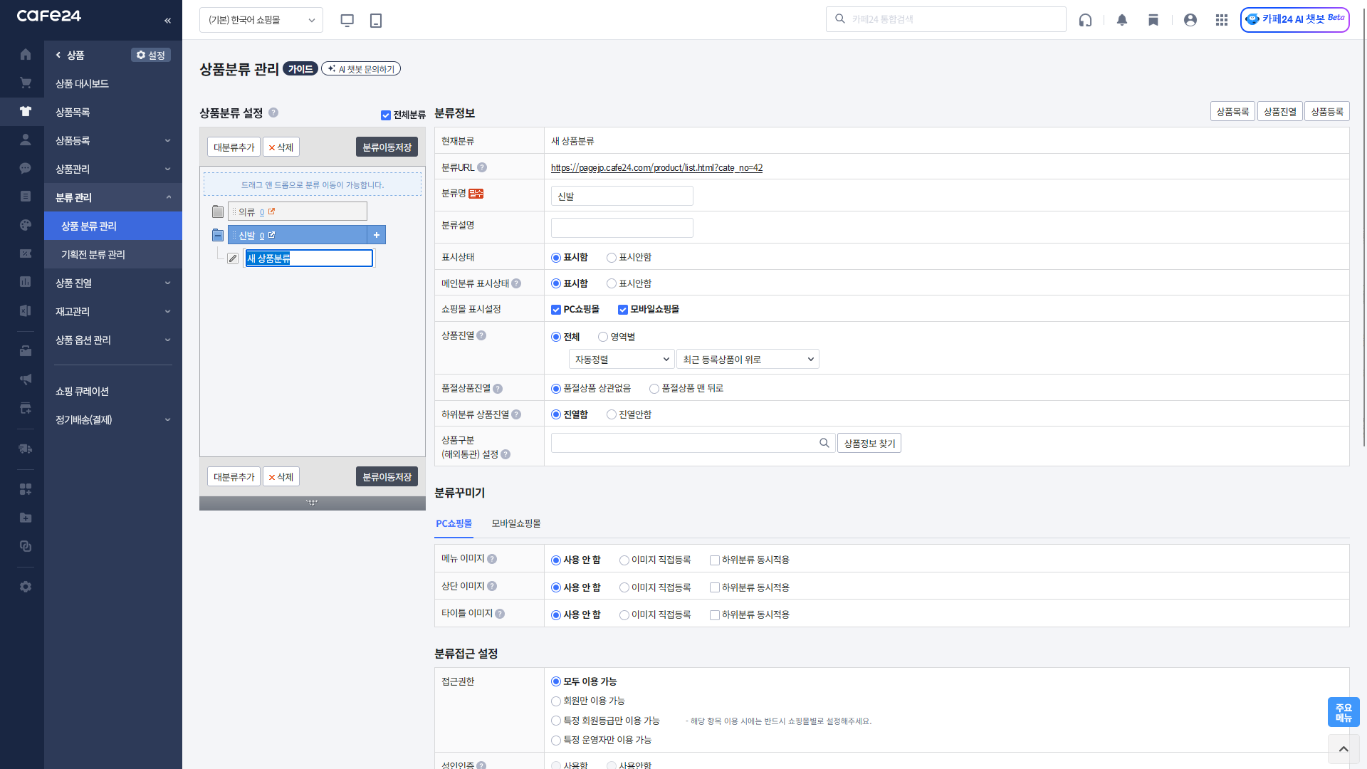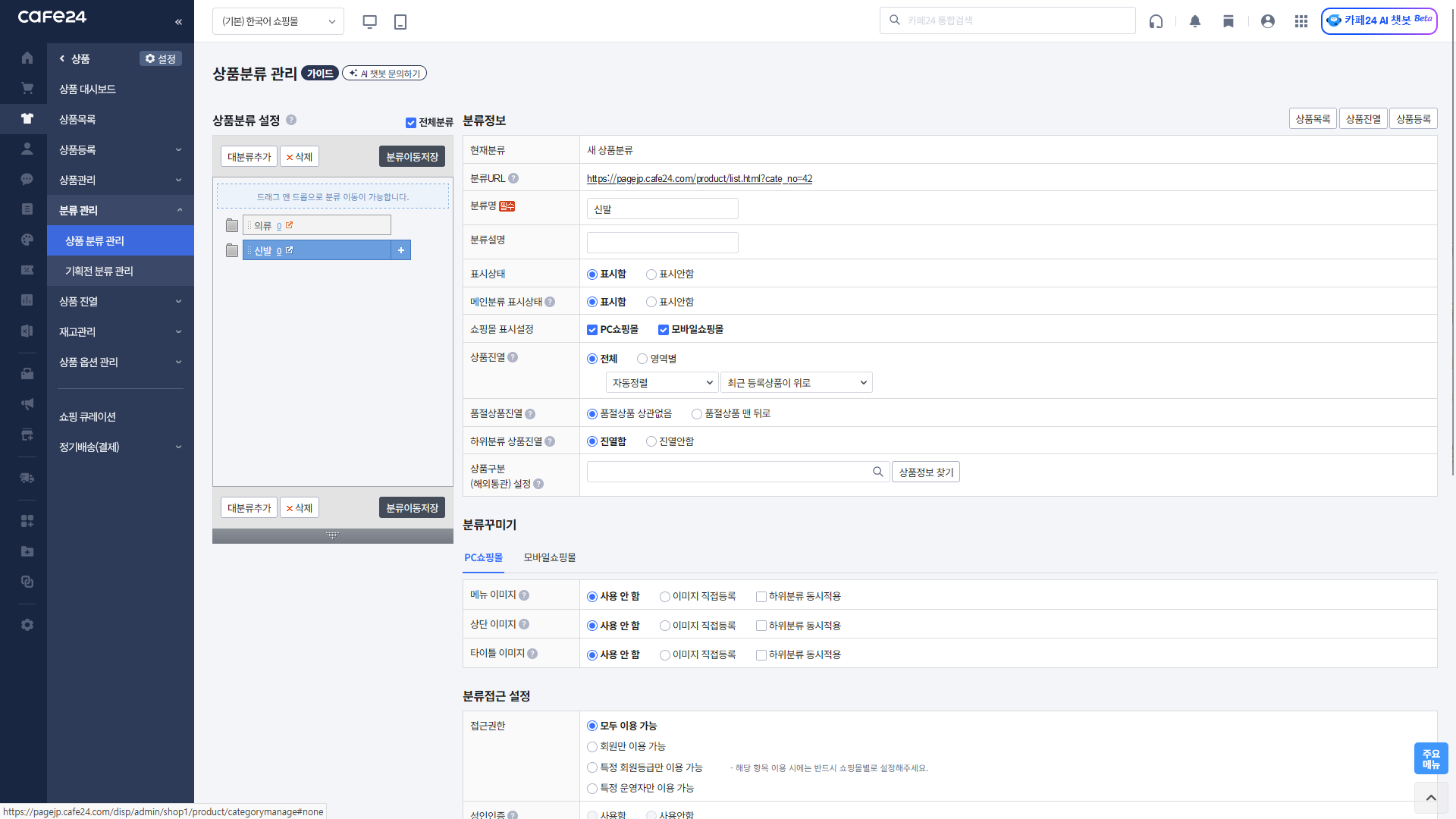 분류 관리 > 상품 분류 관리를 눌러주세요.