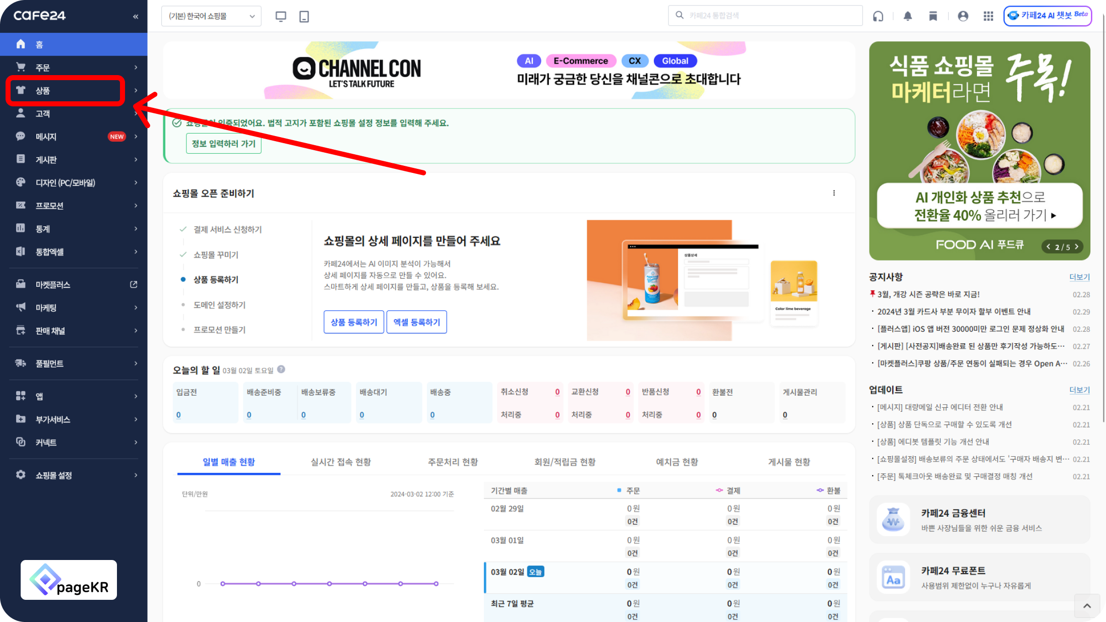 상품 분류 설정을 위해서 왼쪽 대시보드에서 [상품]을 눌러주세요.