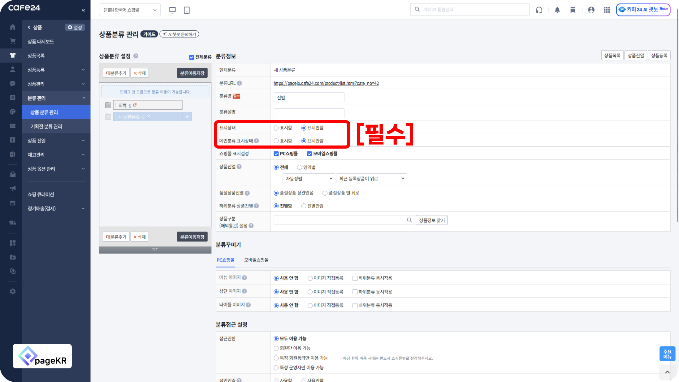 이제 분류명을 적어주셨다면 메인 분류 표시상태와 쇼핑몰 표시 설정을 활성화로 변경해주세요.