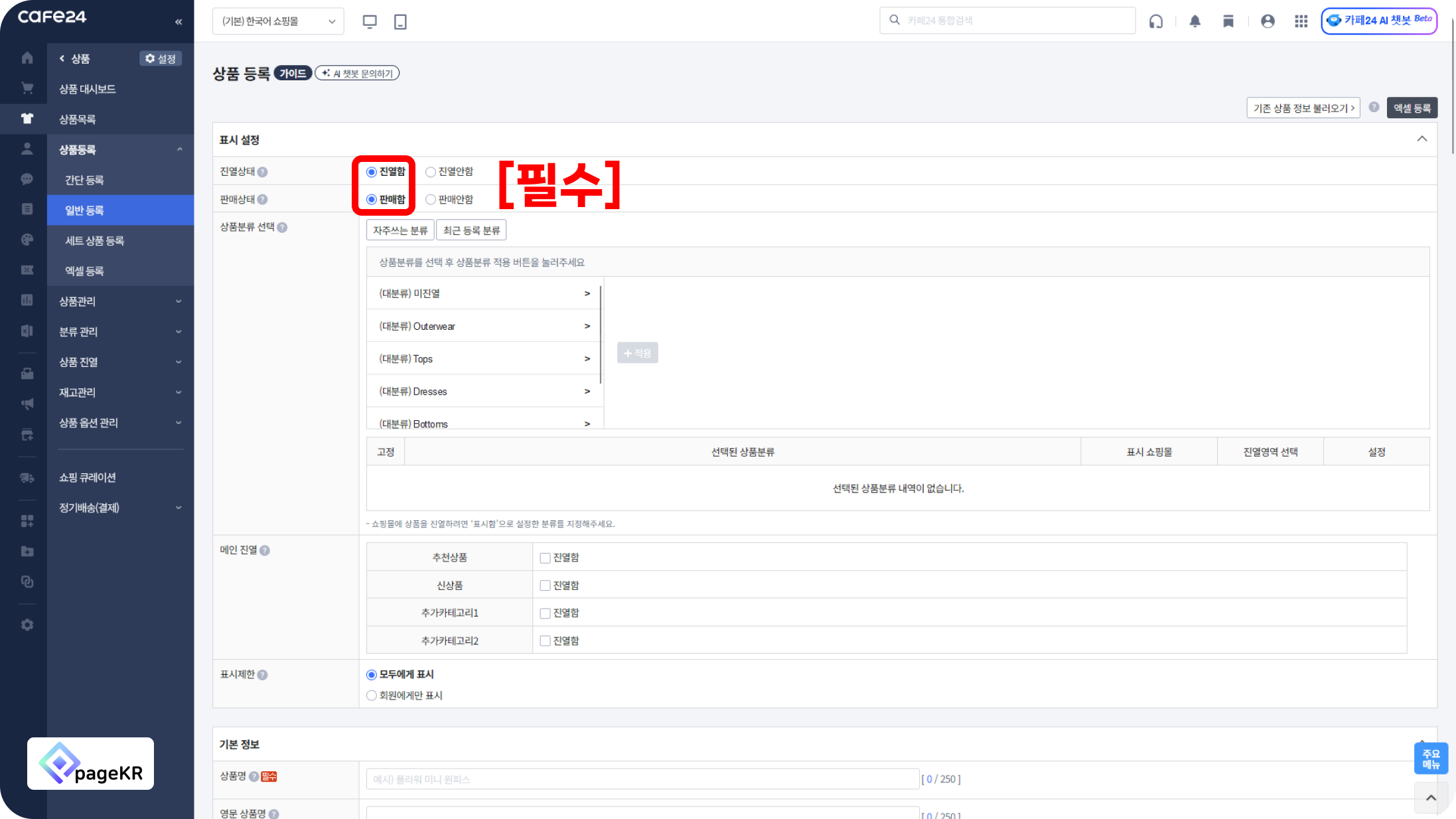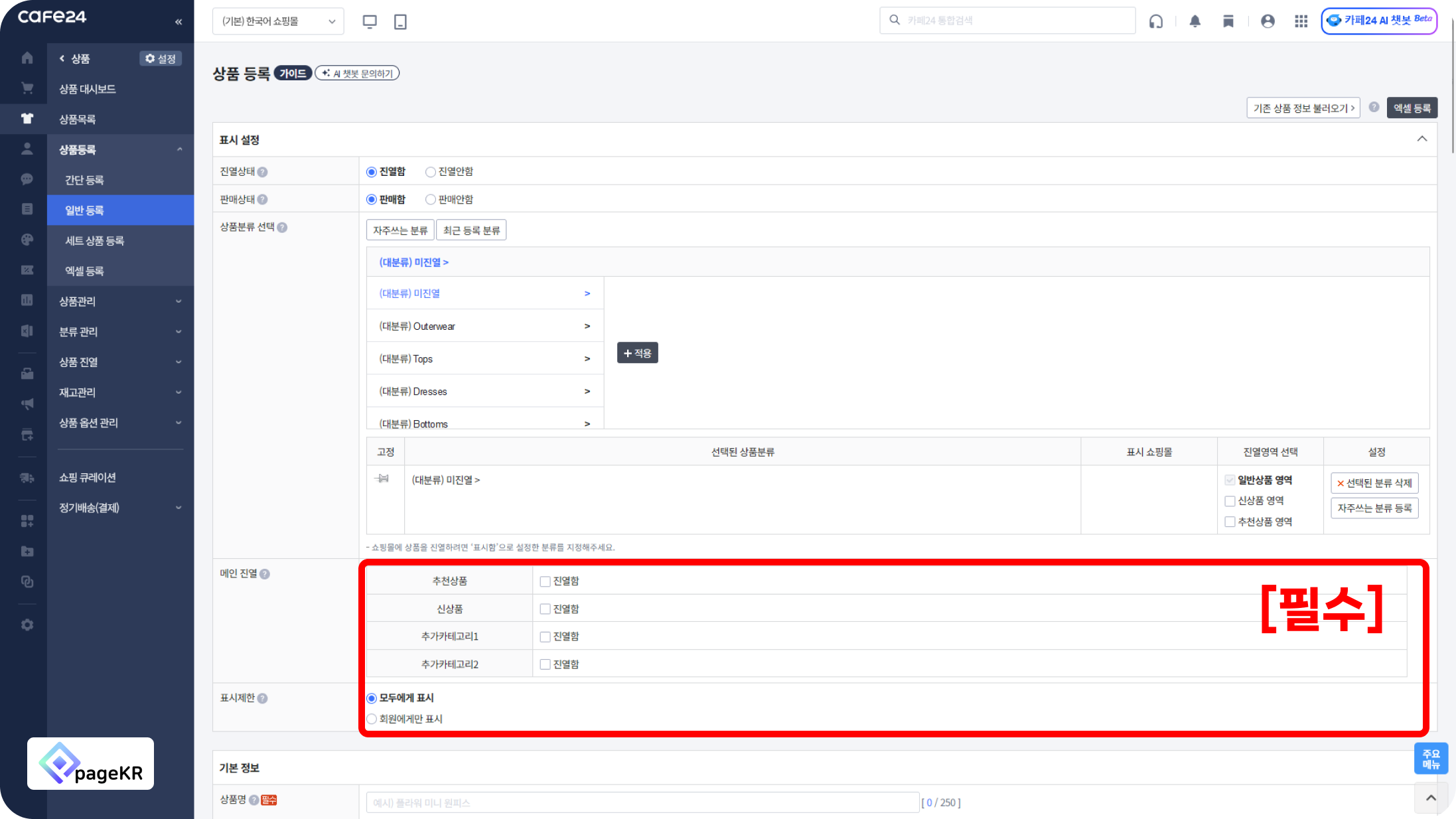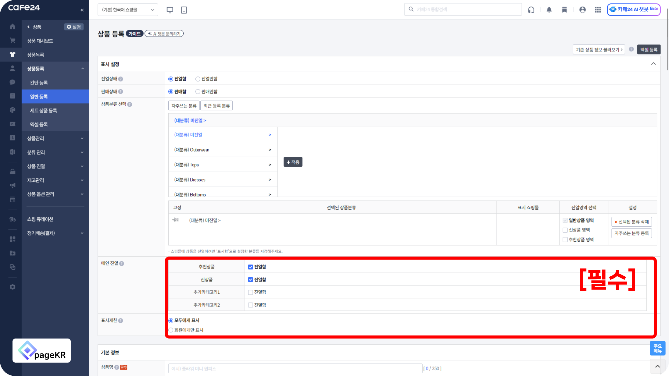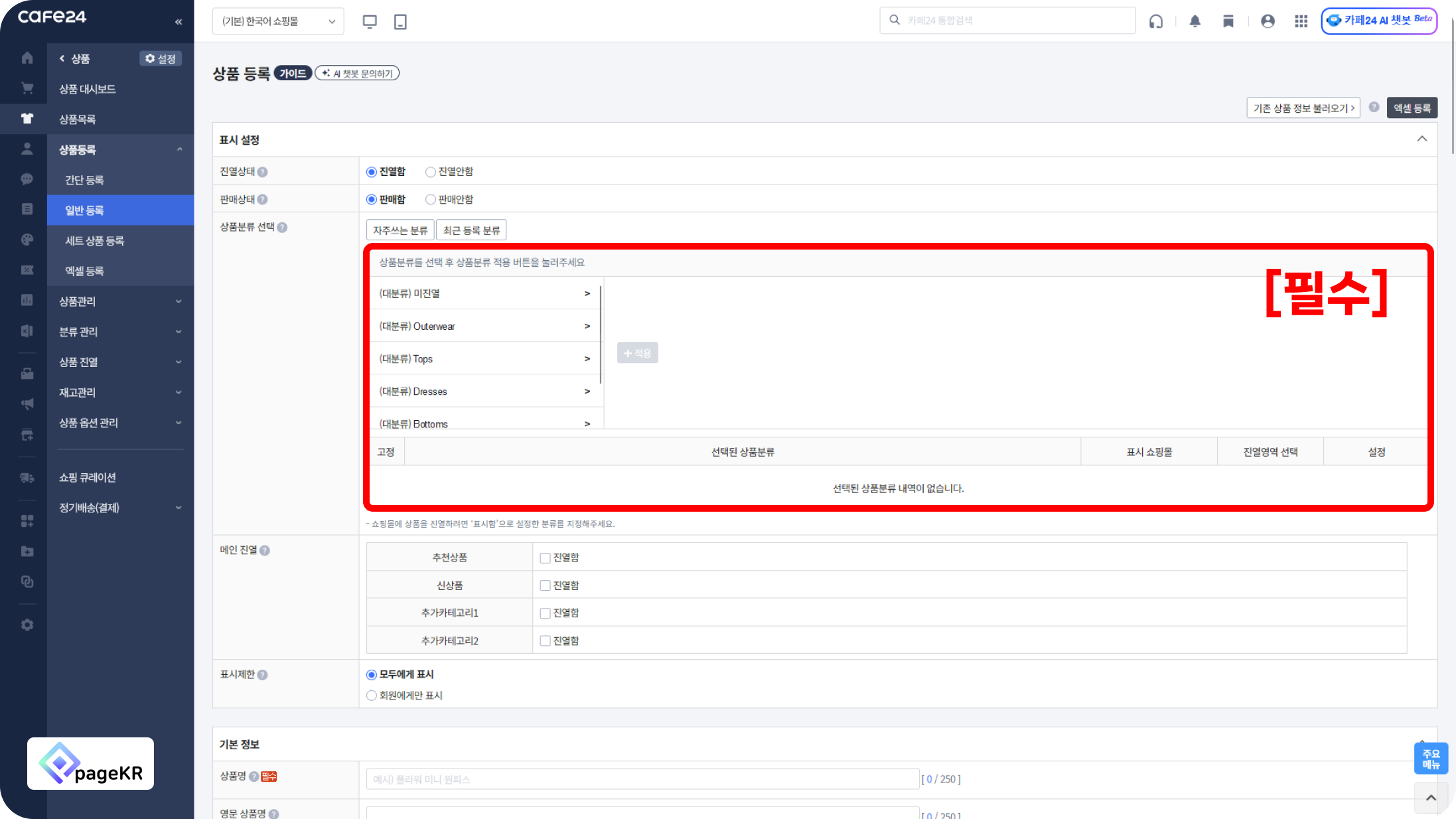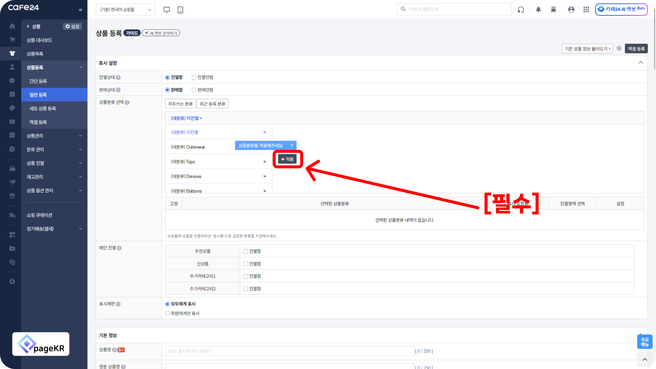 상품 분류는 필수적으로 선택해주셔야 합니다. 선택하지 않으실 경우에는 상품이 노출되지 않습니다.