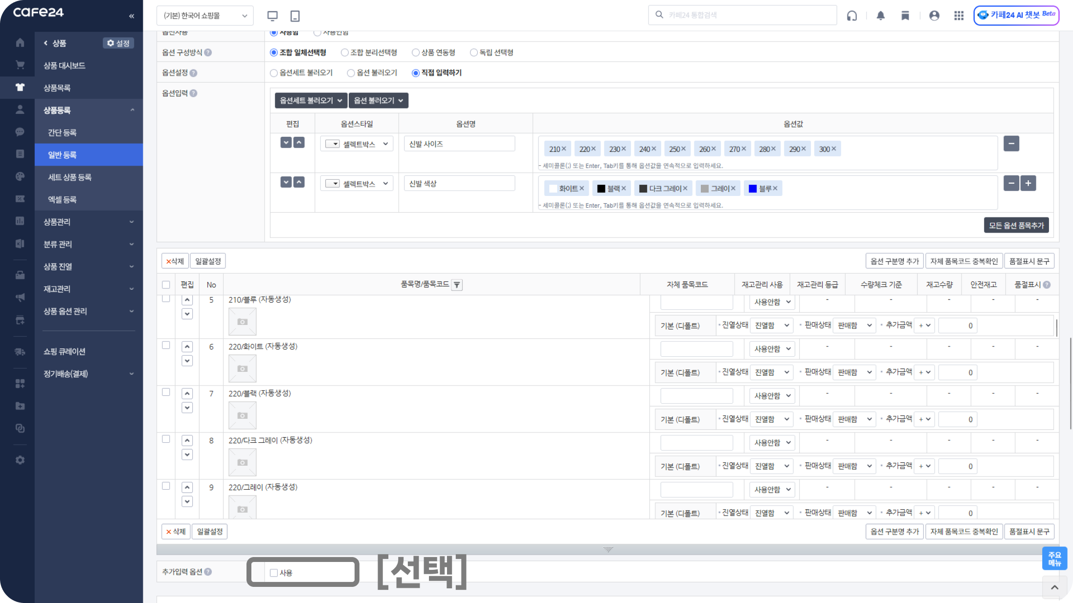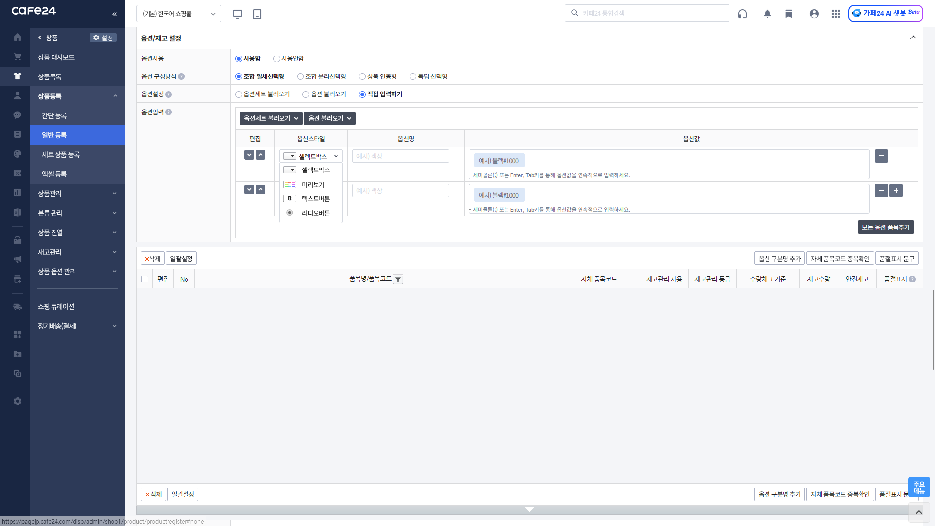 제작을 위해서는 [직접 입력하기]를 선택해서 조합 일체 선택형으로 옵션을 제작해보겠습니다.