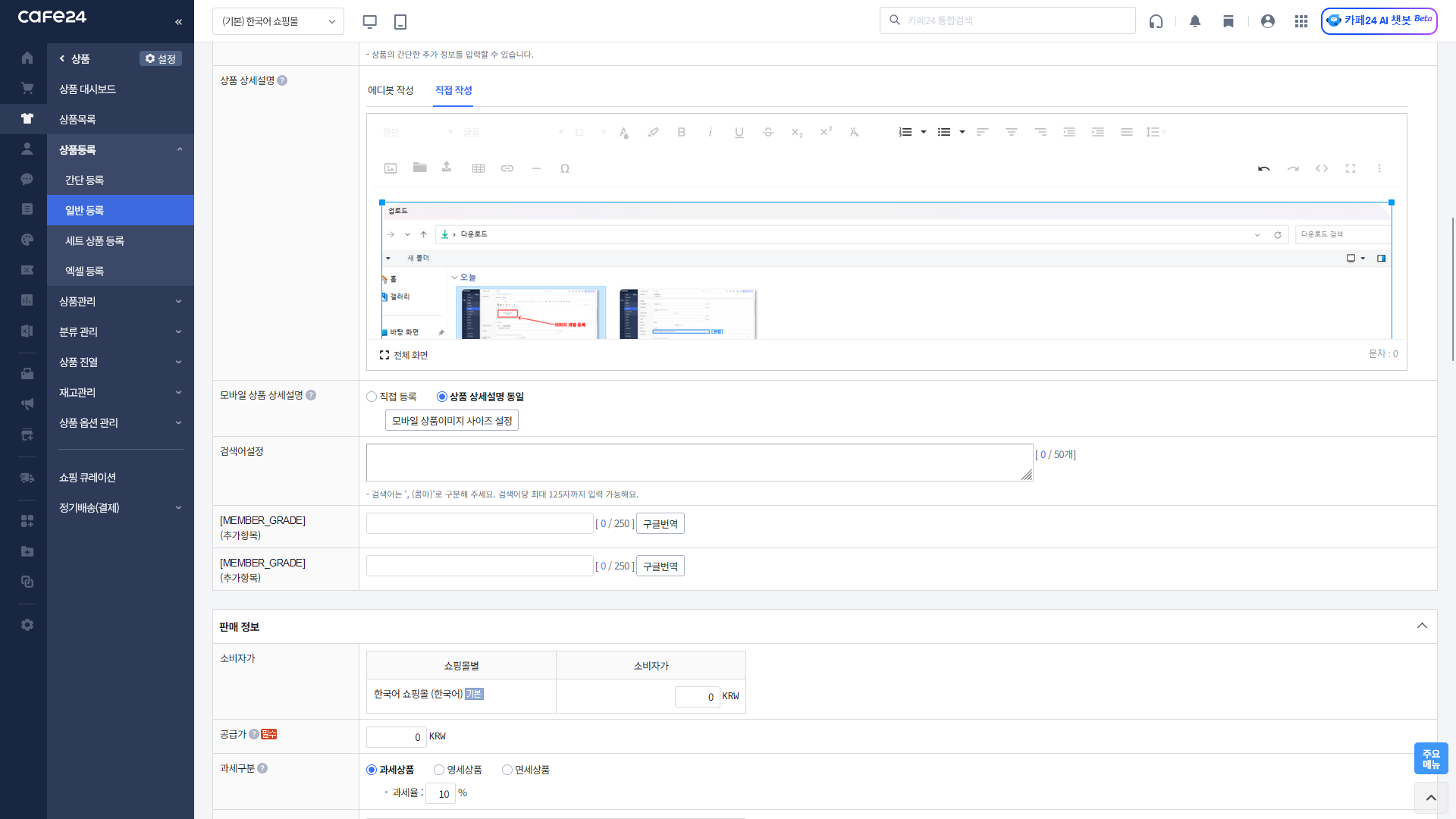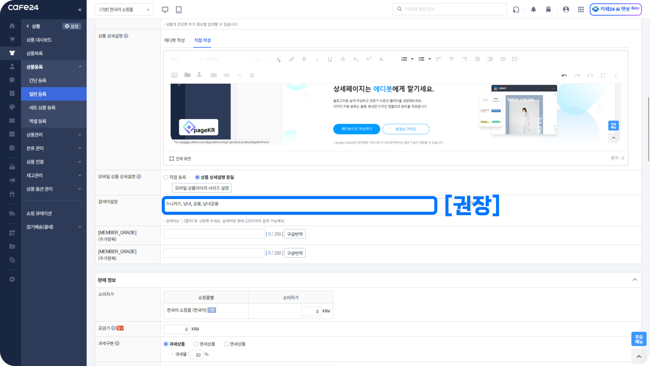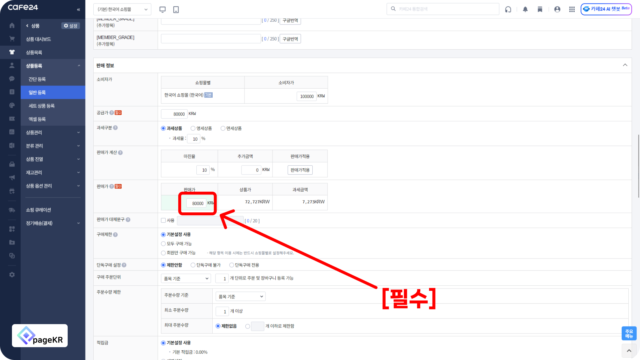 판매가는 아까 안내드린바와 같이 공급가와 동일하게 지정해주시면 됩니다.