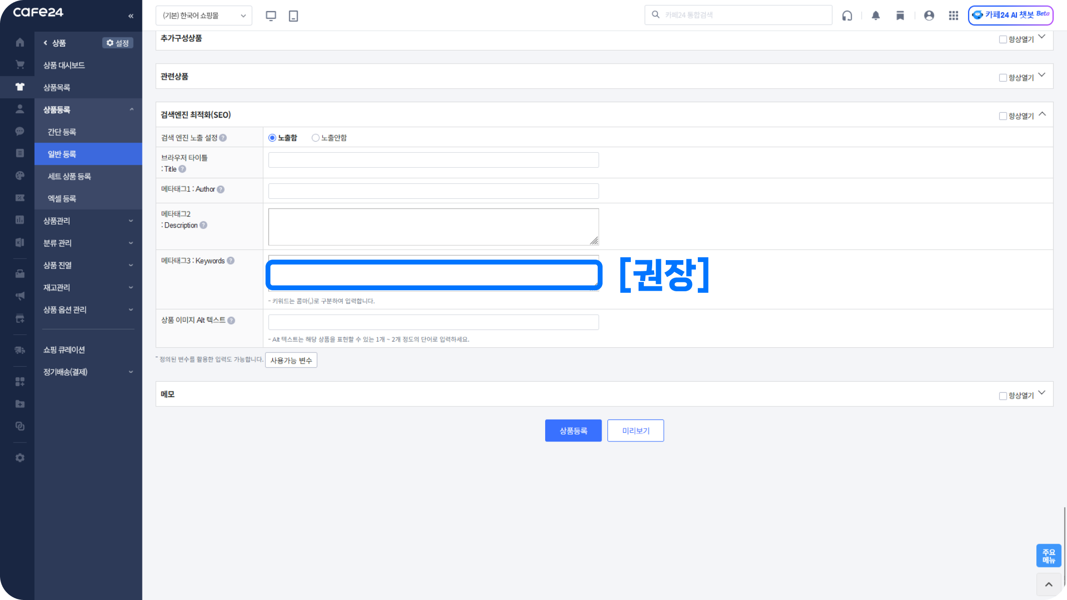 위의 검색어 설정에서 검색어 목록을 그대로 복사해서 메타태그3에 붙여넣기 해주시면 됩니다.