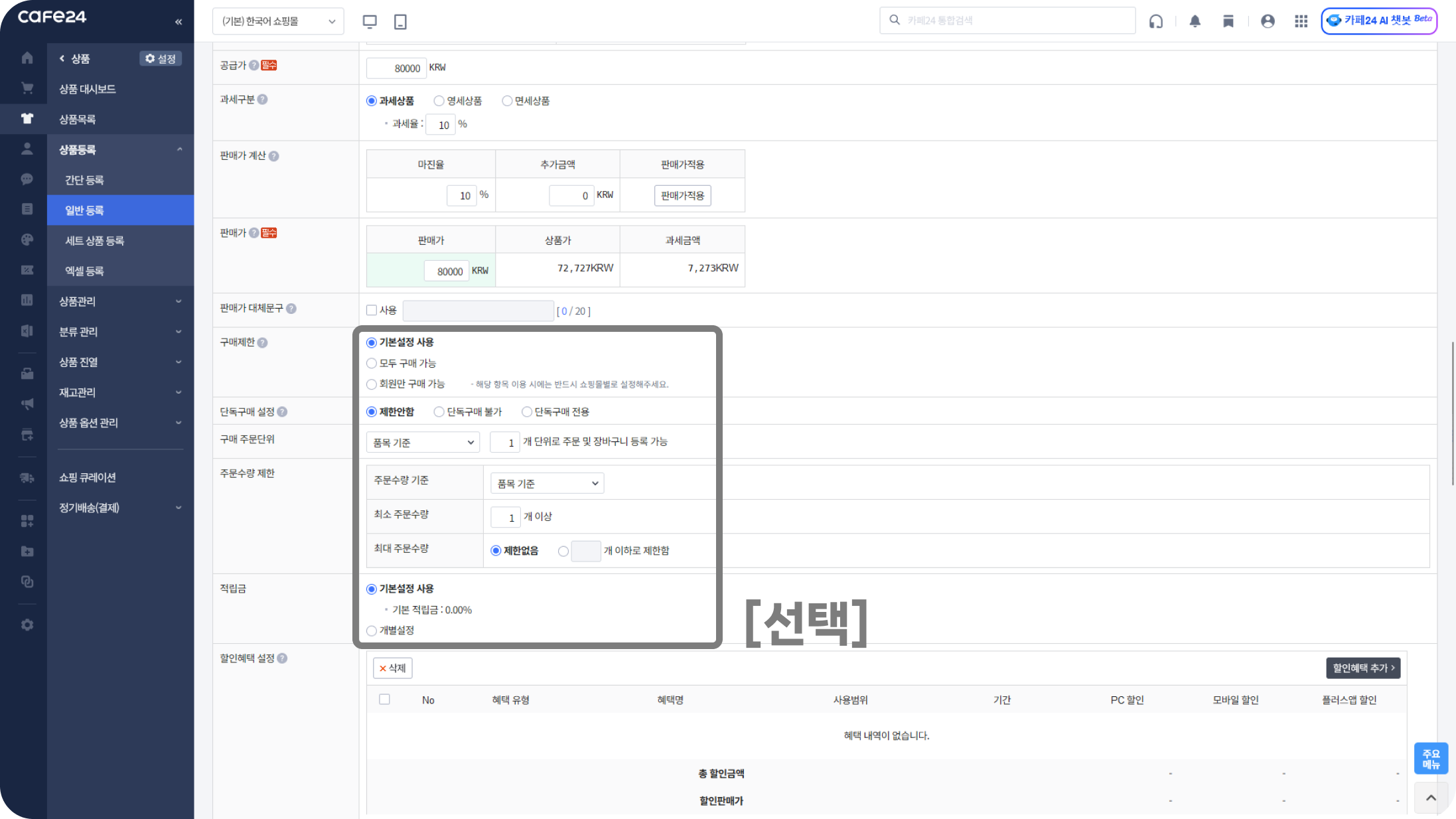 구매제한은 회원만 구매 가능/특정 회원만 구매 가능/전체 구매 가능으로 지정이 가능합니다.