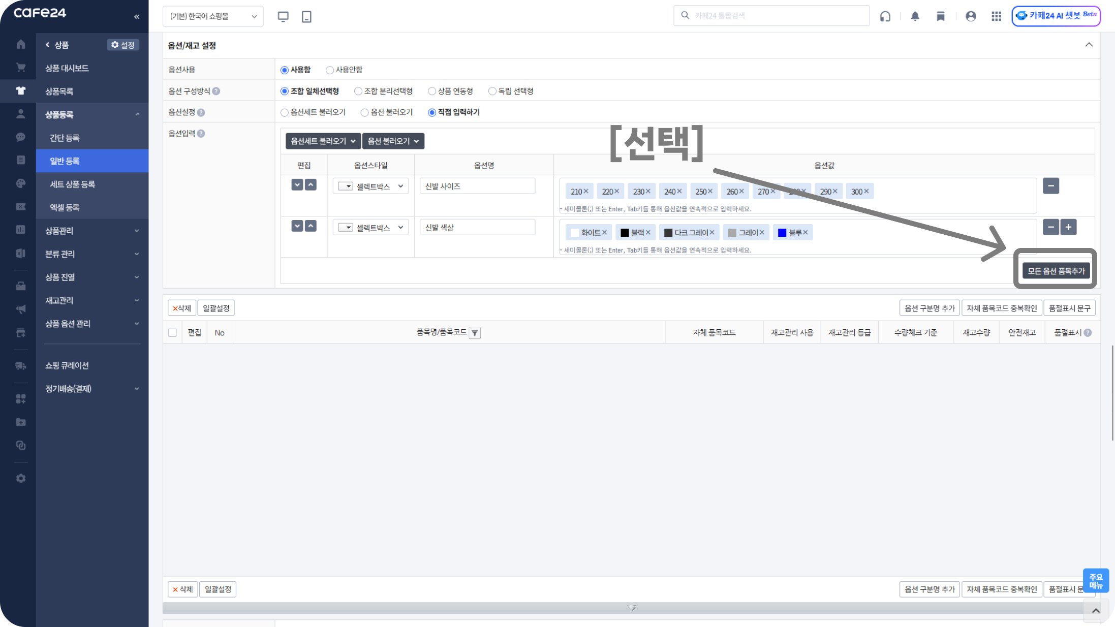 이렇게 옵션을 모두 입력해주셨다면, [모든 옵션 품목추가]를 클릭해주시면 됩니다.