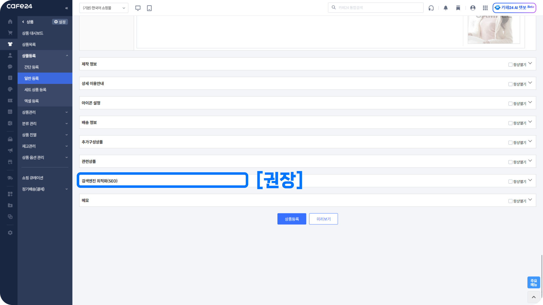 [추천상품]과 [신상품]은 상품의 진열을 위해서는 무조건 선택해주셔야 합니다.