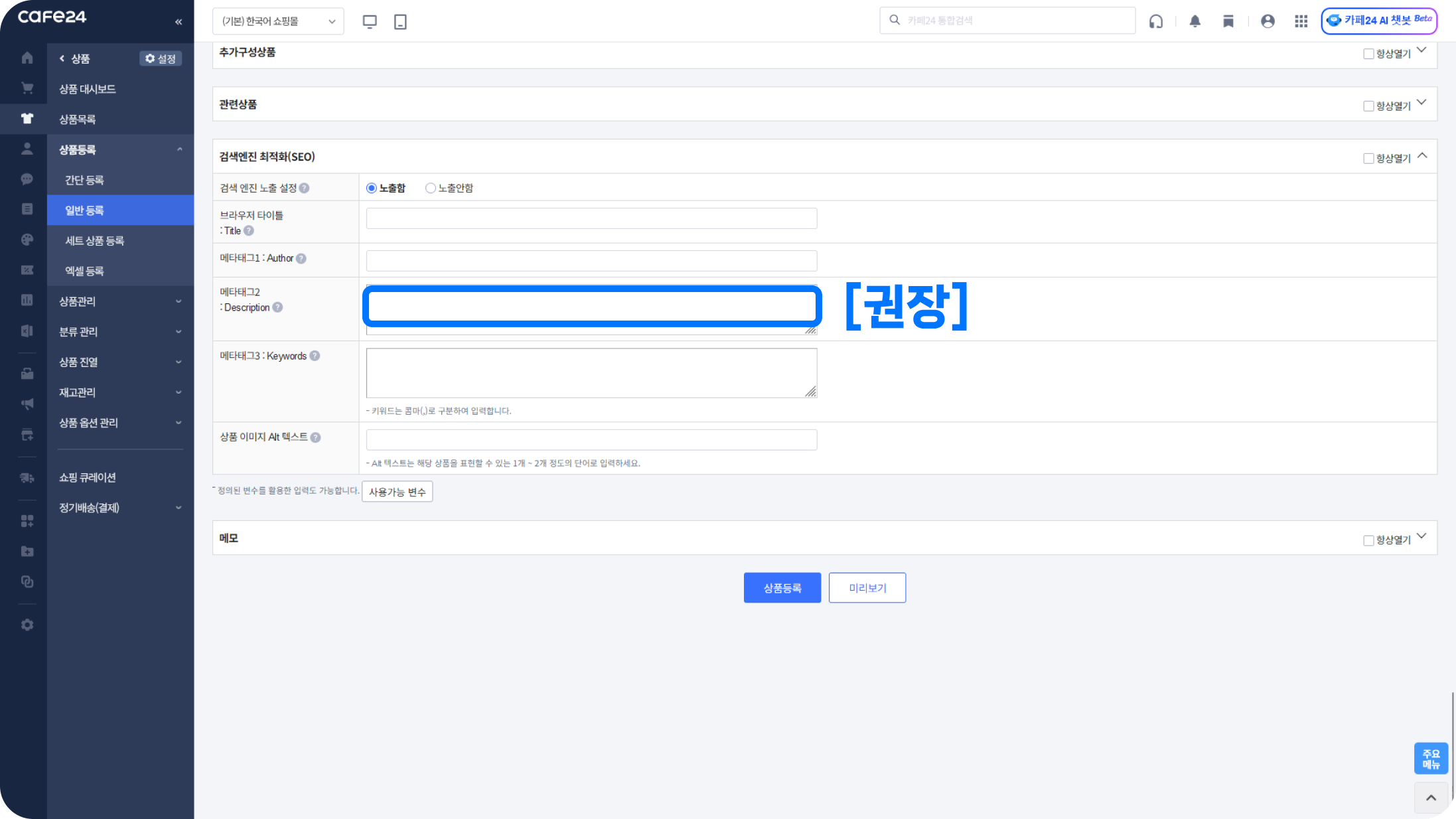상품 간략설명 또는 상품 요약 설명을 복사하여 메타태그2 : description에 붙여넣기해주시면 됩니다.
