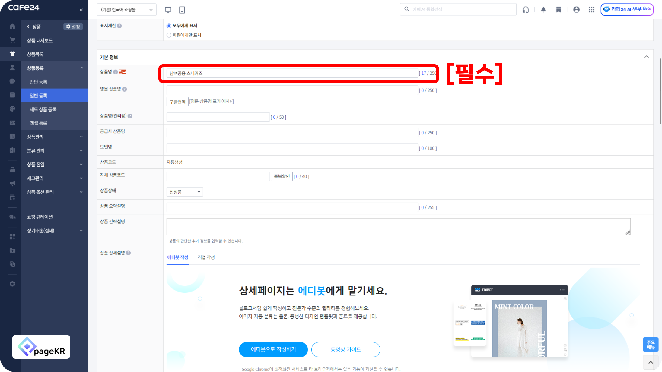 상품 상세페이지는 에디봇과 직접 작성 모두로 가능한데, 에디봇의 경우 일부 브라우저 미지원 등의 문제로 인하여 직접 작성 방법으로 안내해드리겠습니다.