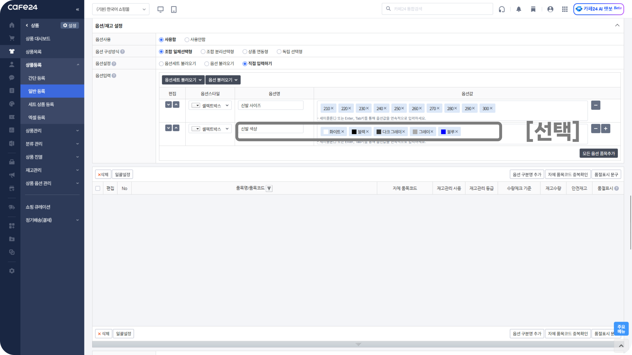 이렇게 아래로 내려주시면 옵션 및 재고를 설정하실 수 있습니다.