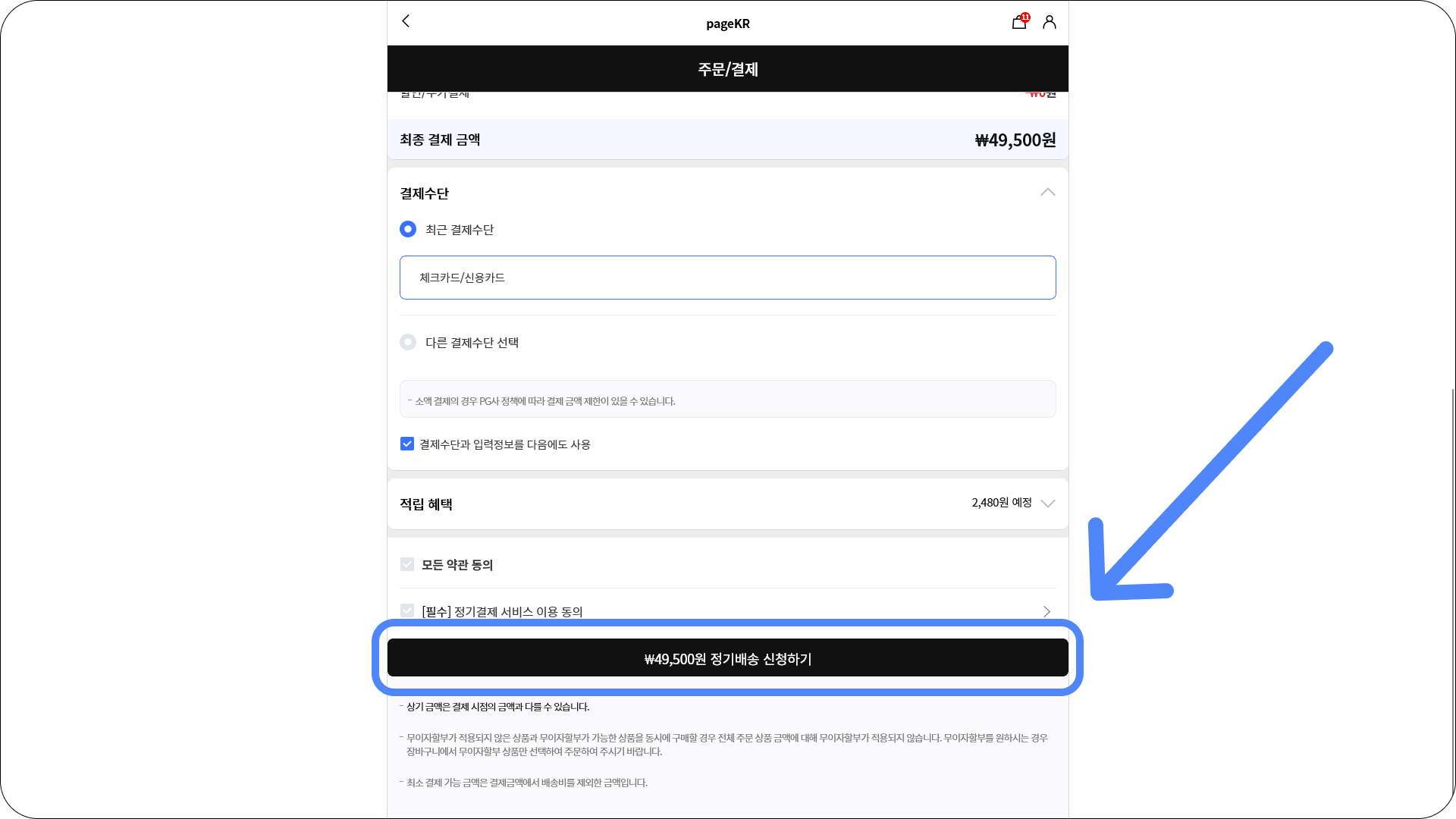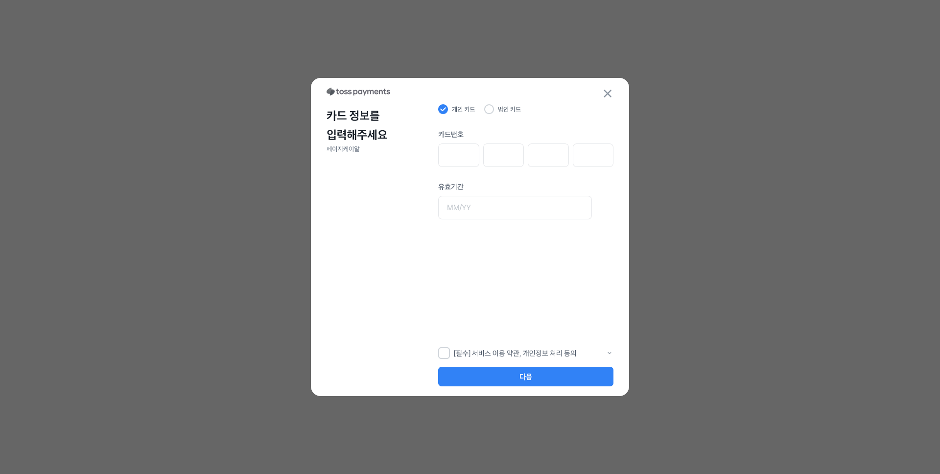 결제버튼을 눌러주시면, 이렇게 정기결제 카드 등록을 위한 토스페이먼츠사 PG 창이 뜹니다.