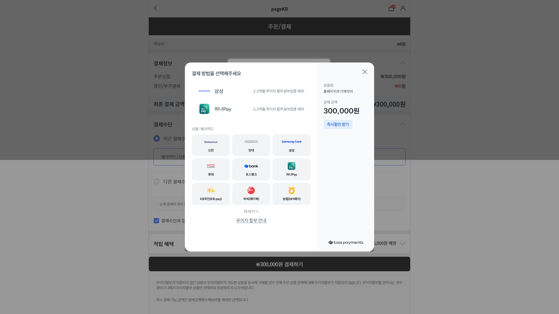이렇게 토스페이먼츠 PG사 창이 뜨며, 여기서 주로 사용하시는 신용카드나 체크카드로 결제해주시면 됩니다.
